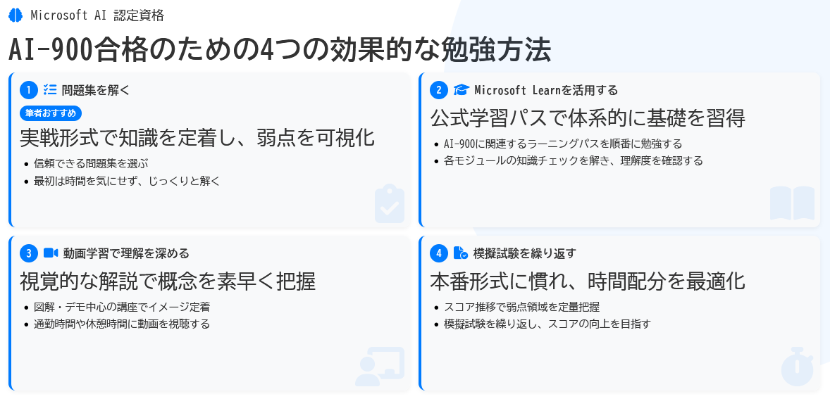 AI-900合格のために効果的な勉強方法は、以下の4つです。