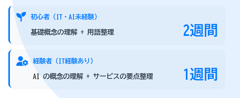 IT業界やAI分野の経験がない初心者の場合、AI-900の合格に必要な勉強時間は約2週間程度が目安です。