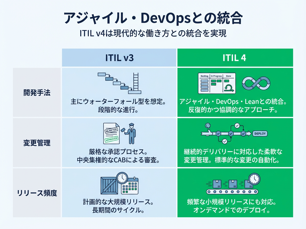ITIL v4の大きな特徴の一つが、アジャイル、DevOps、Leanなど現代的な働き方との統合です。v3が主にウォーターフォール型の開発を前提としていたのに対し、v4はより柔軟で迅速な開発手法にも対応しています。
