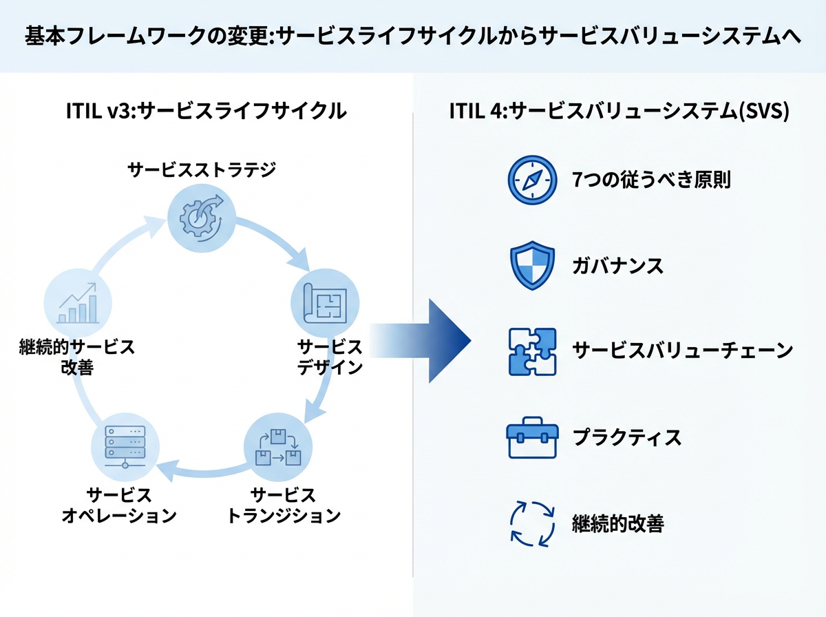 ITILv3とv4の最も大きな違いは、基本フレームワークが「サービスライフサイクル」から「サービスバリューシステム(SVS)」へと変更されたことです。